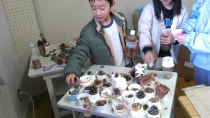 「あきであそぼう ○○ランド」の学習では、自分たちで作った遊び場や木の実で作ったお店屋さんに友達を招待しようと取り組んでいました。