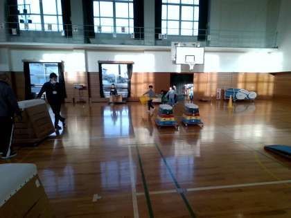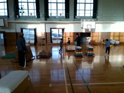 朝、体育館では、担当教諭が1限目の体育「跳び箱あそび」の準備をしていました。