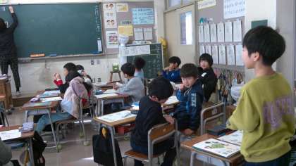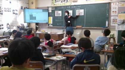「○個ずつ」のまとまりを見つけて、かけ算を使い、全体の個数を求める学習をしています。いろいろな考え方ができるので、友達が考えたやり方以外の方法を進んで考えていました。