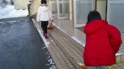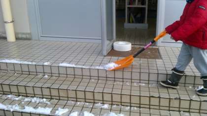 さっそく雪かきをしている2年生がいます。玄関の階段でみんなが滑らないように雪をどけてくれていました。ありがとう!
