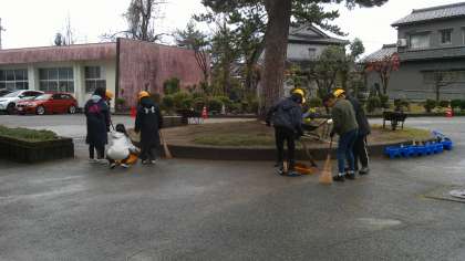 終業式の朝もいつもと変わらず、前庭の落ち葉掃きをする環境委員会の子どもたちです。雨の日以外、一日も休むことなく、学校の顔である前庭を掃除してくれました。自慢の子どもたちです。