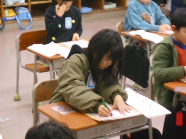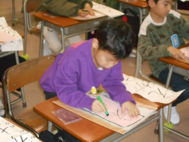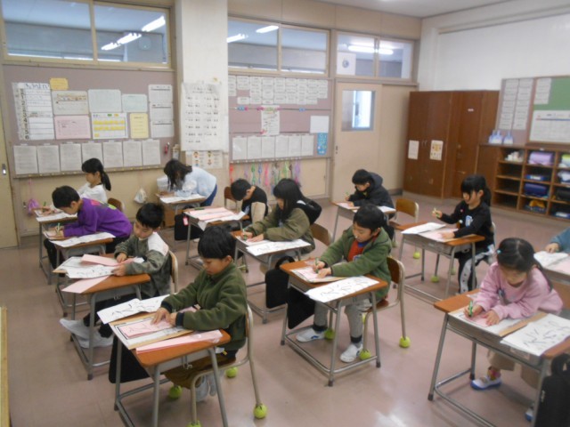 始業式の後、書初大会を行いました。1文字ずつ丁寧に書いていました。