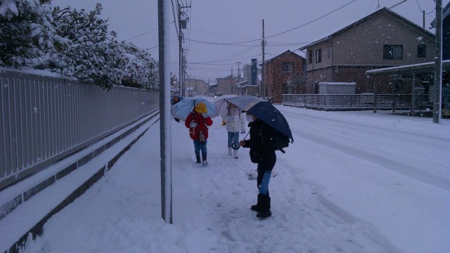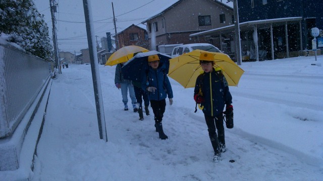 雪道では下学年の歩くペースが遅くなるので、いつも以上にゆっくり歩いたり、後ろの下級生を見守りながら歩いたり、手をつないだりしている上級生の姿が見られました。
