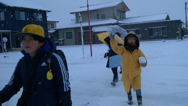 また、雪玉を手に楽しそうに登校する子どもたちもいます。