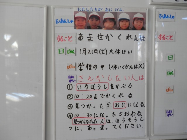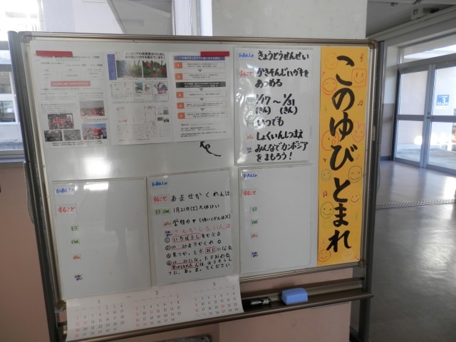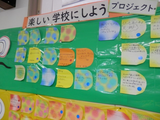 「たのしい学校プロジェクト」や「わくわくフォーム」での子どもたちの提案が実現しやすくなるように、「このゆびとまれ」ボードを設置しました。学校が楽しく、よりよくなることやみんなから協力を得たいことなど、ボードに書いて全校にお知らせできる掲示板です。さっそく、「あませおにごっこをしよう」や「書きそんじはがきを集めよう」のお知らせが貼られていました。子どもらしいユニークな発想から生まれた提案の実現が楽しみです。