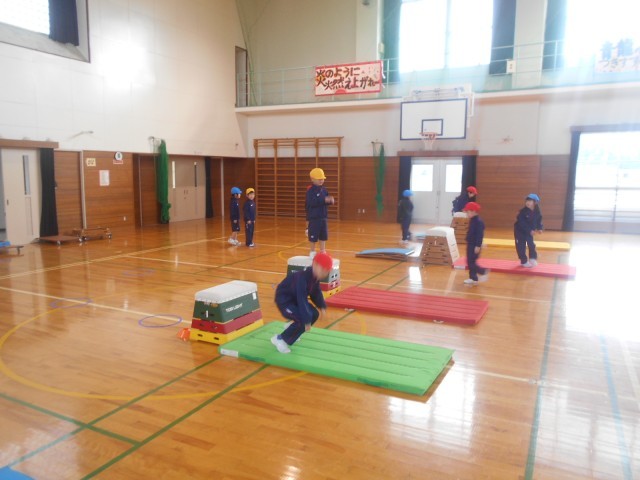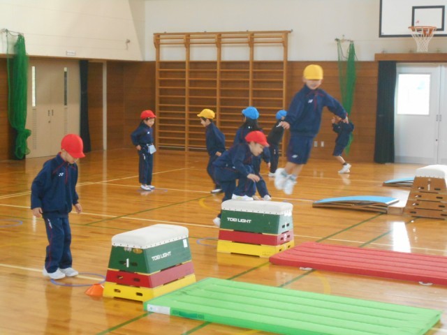 体育科で「跳び箱あそび」の学習を行っています。平均台を跳んだり、しっかりと両足で踏み切ったりする動きを練習しています。