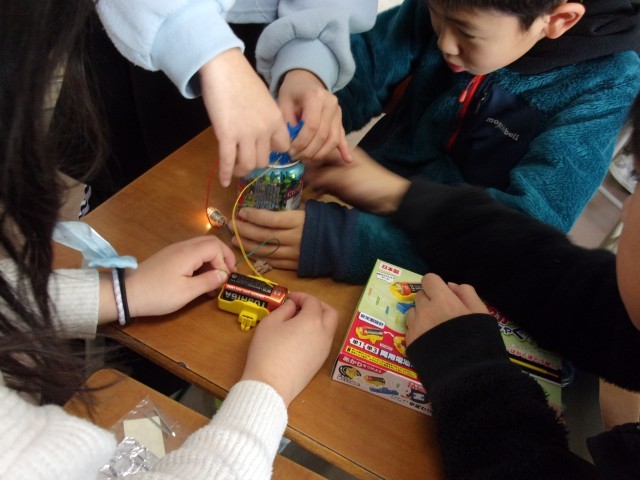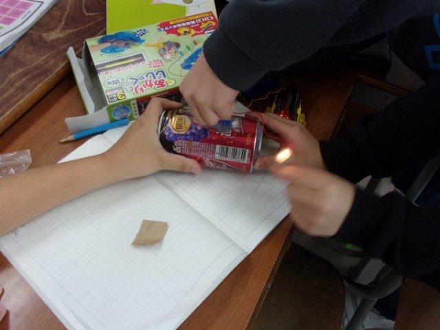 アルミ缶やスチール缶は電気が通らなかったのは表面に色がついていてコーティングされているからだと予想した子供たち。そこで紙やすりで削って実験してみると、見事に明かりはつきました。