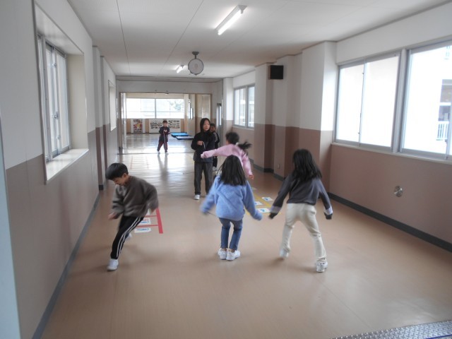 6年生といっしょに長縄跳びの練習をしています。たくさん跳ぼうと一生懸命練習しています。
