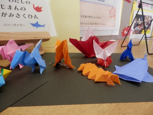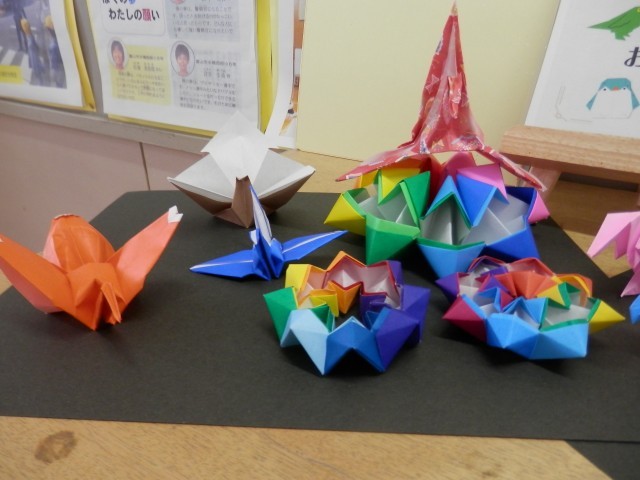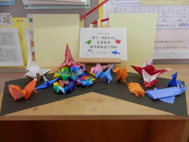このよびとまれボードの呼びかけに、4名の子どもたちが折り紙作品を持ってきてくれました。どうやって作るのかわからない難しい作品が並びます。作品を見た子供の中には、作り方を教えてほしいなあと言っている人もいました。職員室前に展示しています。