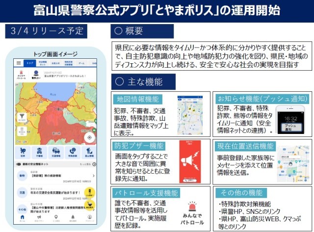 県警察では、県民に必要な情報をタイムリーかつ体系的にわかりやすく提供することで、自主防犯意識の向上や地域防犯力の強化を図り、県民・地域の安全で安心な社会の実現を目指すため、今年3月に富山県警察公式アプリ「とやまポリス」をリリースする予定です。