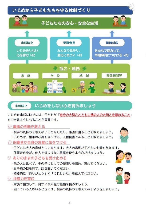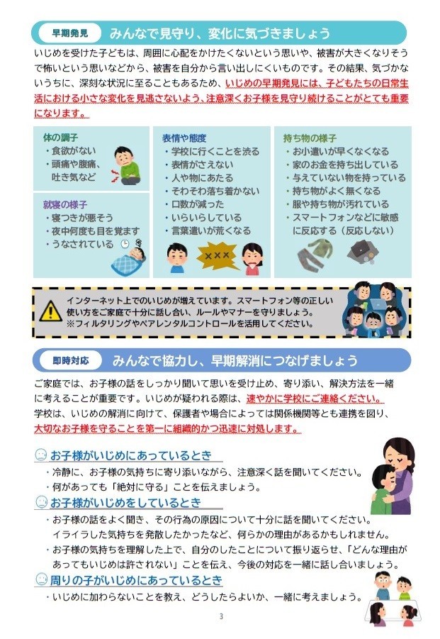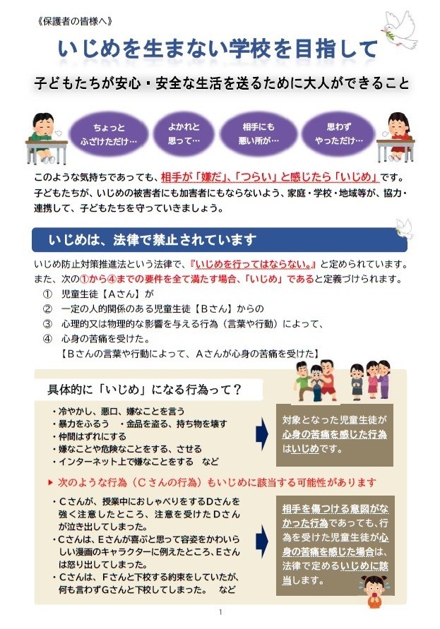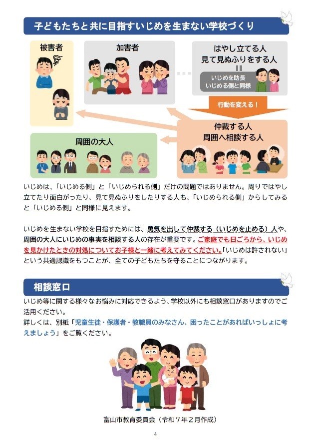 いじめを生まない学校を目指して 公開日 2025/02/15 更新日 2025/02/15 お知らせ 富山市教育委員会より保護者向けいじめ防止啓発リーフレットが届きました。配布文書からご覧いただけます。②資料-1_いじめを生まない学校を目指して(リーフレット)③資料-2_教育相談窓口等紹介(リーフレット) +1