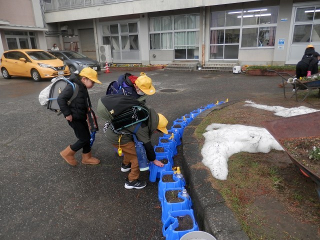 1年生は、自分の育てているチューリップに「おはよう」の挨拶をしています。そして、今まで雪の下にいたので、異常はないかよく観察をしています。