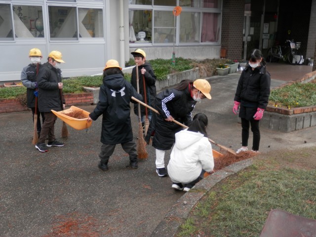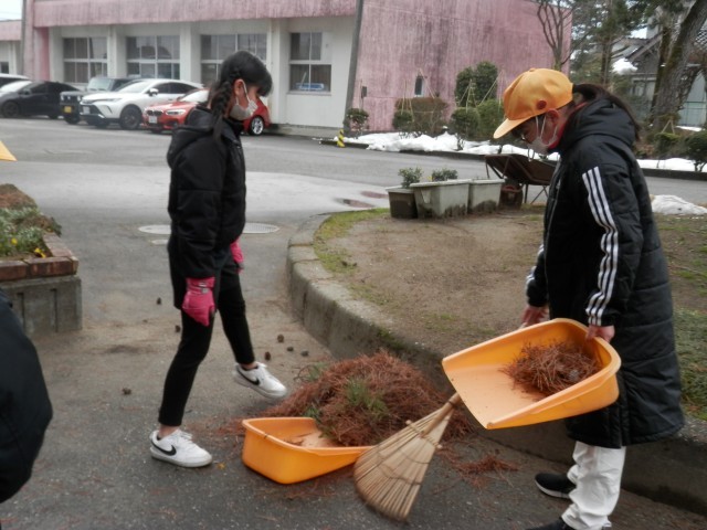 環境委員会の人たちは、雪が溶けたあとに出てきた松葉の掃除をしてくれています。たっぷり松葉を集め、正面玄関前がすっきりきれいになりました。ありがとう!