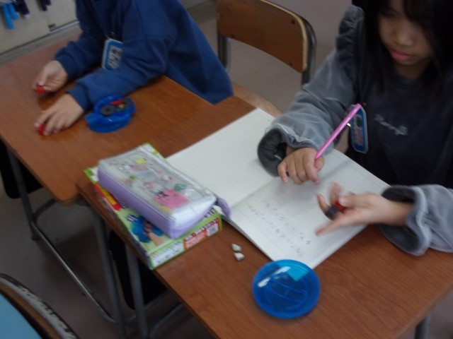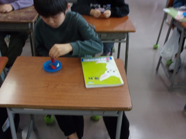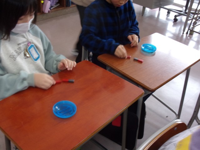 磁石の違う極どうし近づけると「くっつく!」「仲良しだね」、同じ極どうしを近づけると「逃げていった!」と話し、磁石の引き合う、退け合う性質を学習しました。