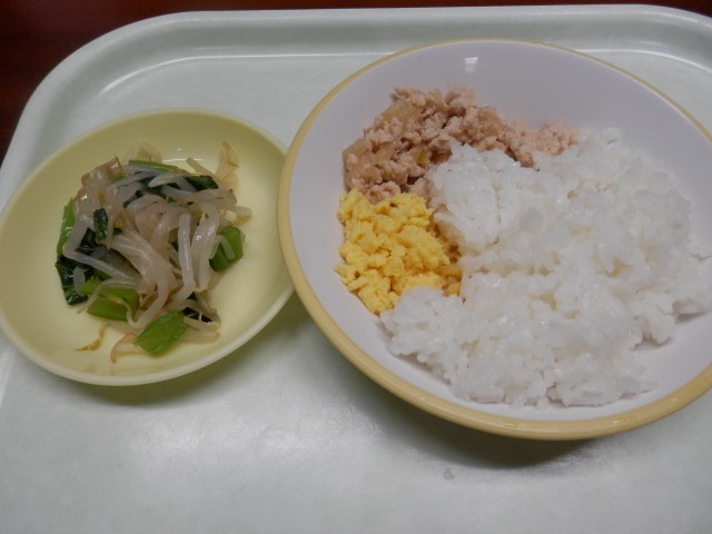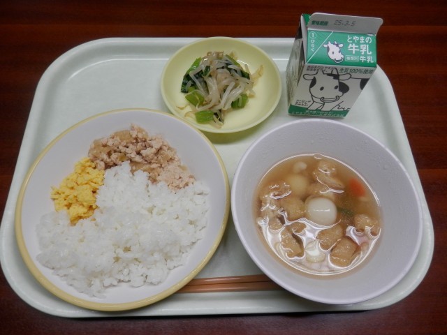 二色丼(とりそぼろ、いりたまご)  牛乳  菜花ひたし  白玉汁  ひなあられ