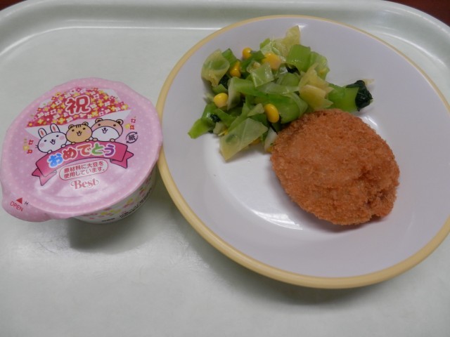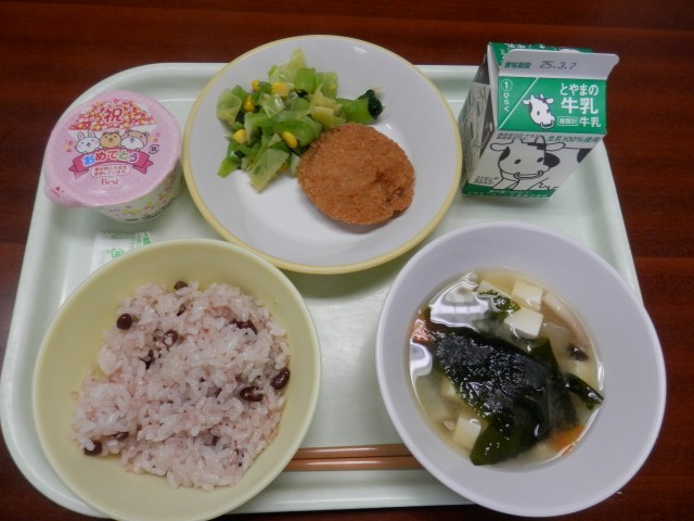 2月28日 今日のこんだて 公開日 2025/02/28 更新日 2025/02/28 給食室 赤飯 牛乳 コーン和え ヒレカツ お祝いゼリー検食 異常なし今日は、卒業をお祝いする献立です。お祝いの時に食べる赤飯がとてもおいしかったです。
