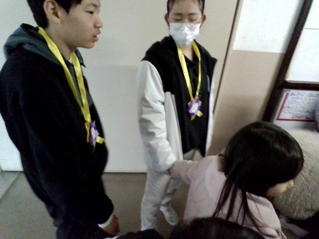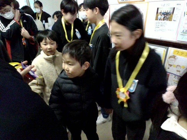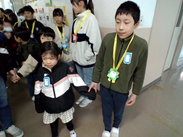 1年生が6年生と手をつなぎ、会場へ案内します。