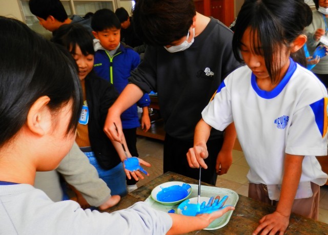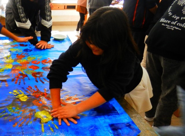 昼休みに楽しいイベントがたくさんありました。「手形アート」では、手に色を付け、向きを考えてペッタンペッタン!楽しみました。