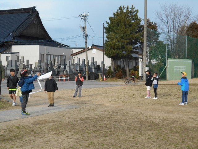 様々な学年の子どもたちが集まり、フリスビーで遊んだり、たこあげをしたりと学年の垣根を越えて楽しく過ごしていました。