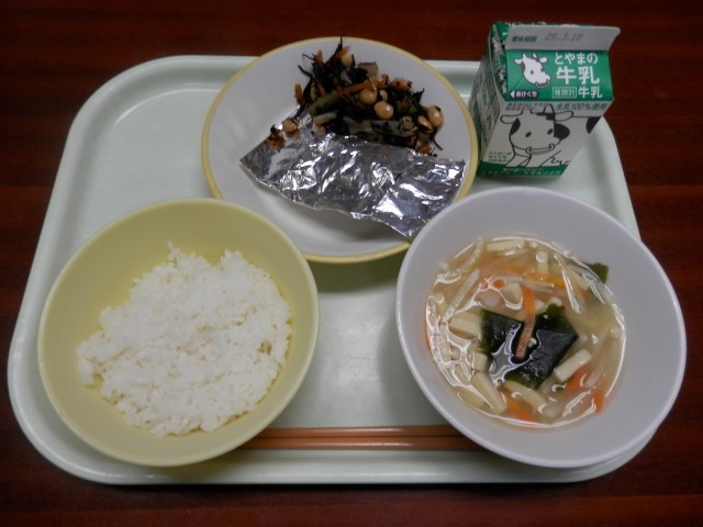 ごはん  牛乳  ひじきの炒め煮  さばの銀紙焼き  五目汁