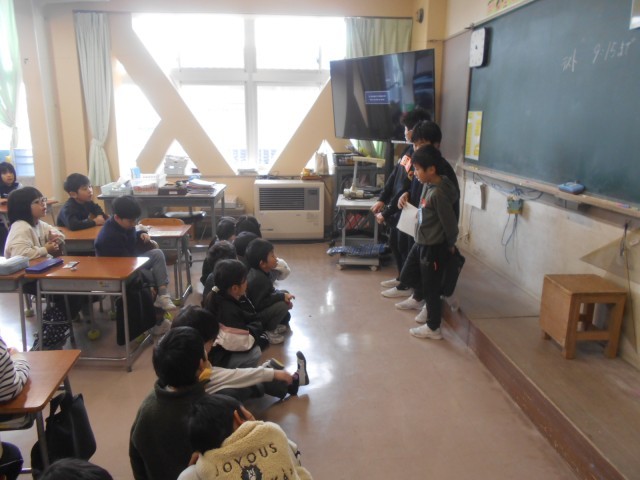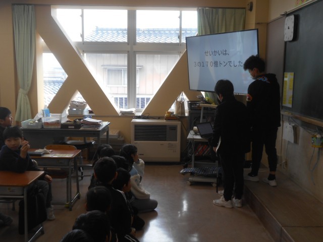 4年生から、環境のゴミについてのお話を聞きました。たくさんのゴミが海に流れついたり、魚が食べてしまったりして将来、おいしい魚が食べられなくなるということに驚いていました。