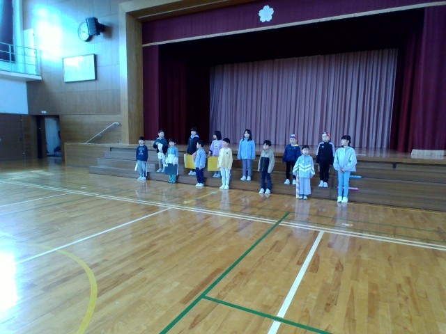 始業式の後、2年生は体育館に残り、「入学お祝いの会」の練習です。