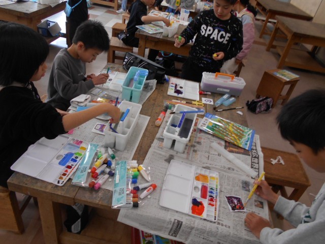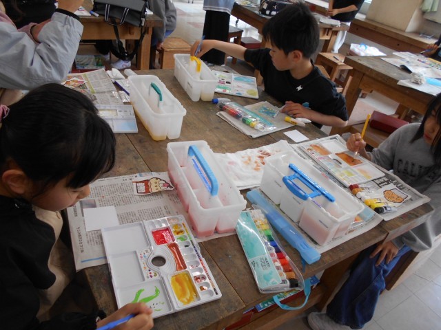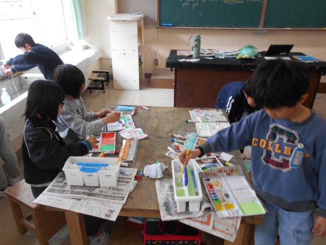 3年生は図工で「絵のぐ+水+ふで=いいかんじ!」の学習をしました。