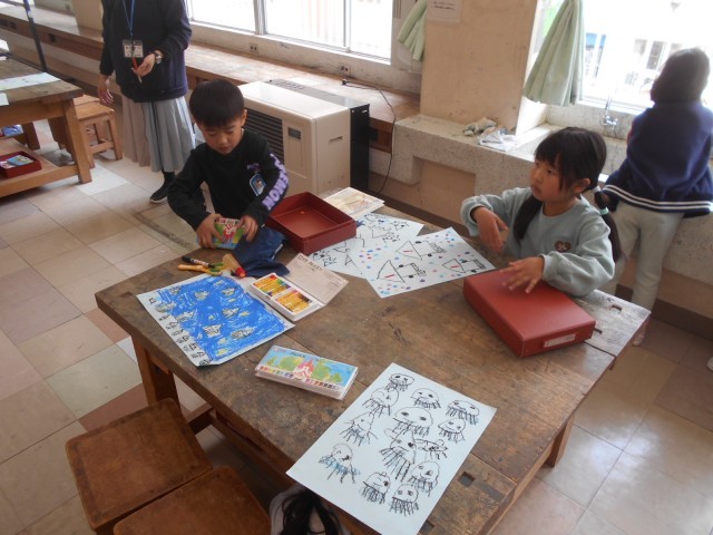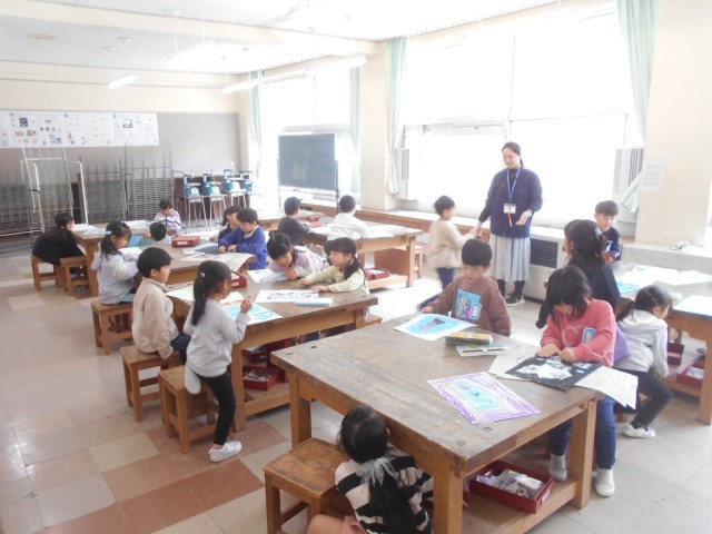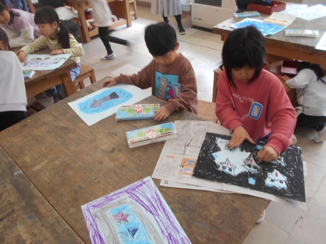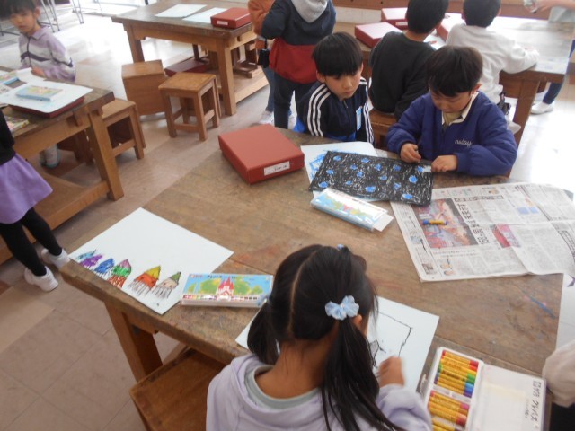 はじめての図工で、図工室に移動して学習しました。今日見てきたホタルイカの絵を描きました。