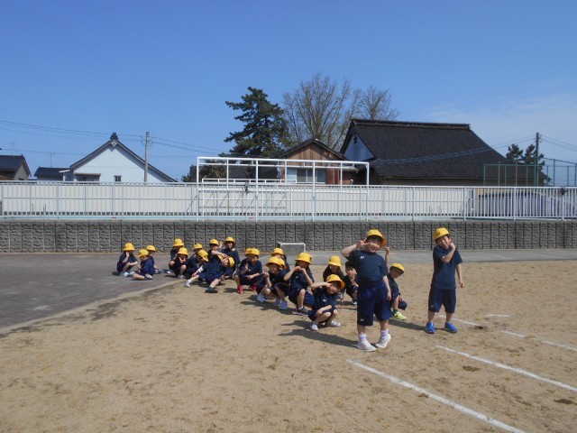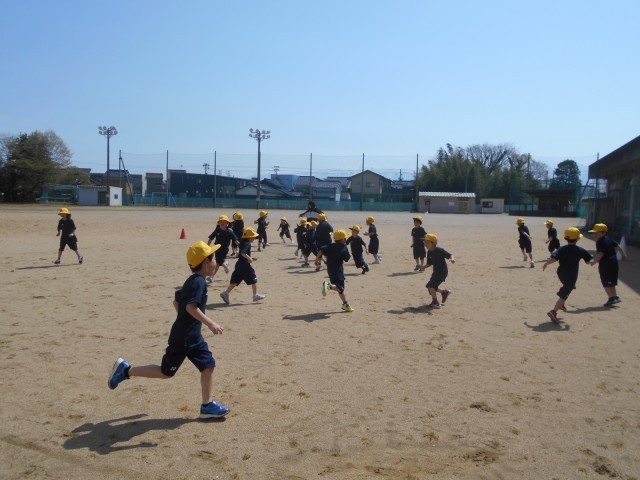 初めての体育では、50m走に挑戦しました。見事、全員ゴールまでまっすぐ走りきることができました。体育の最後に、ふえ鬼ごっこをしました。