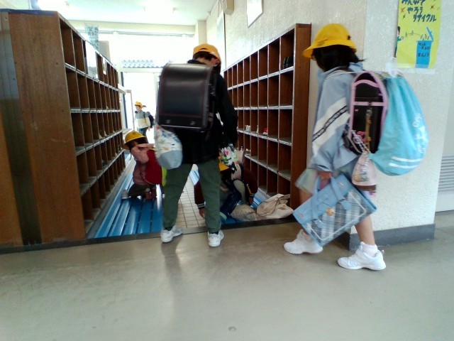 兄妹で仲良く登校してきた子供たち。妹がズックを履き替えるのを優しく待つ、お兄ちゃんがいました。