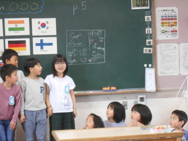 3年生になって始まった外国語活動の学習。今日は、いろいろな国の言葉であいさつをした後、英語で自己紹介をしました。子供たちは、多くの友達と関わることができたようです。
