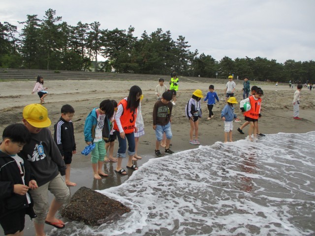 みんなで海の水に触れたり、砂の城をつくったりして楽しく遊びました。最後に「来たときよりも美しく」の気持ちでゴミ拾いをしてから帰りました。