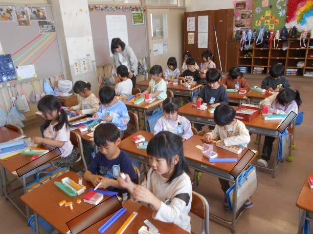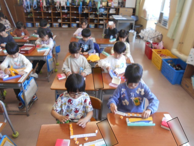 算数では、算数ボックスをつかっての学習がはじまりました。まず初めに、ブロックやおはじきで遊びました。これからもどんどん使っていきます。