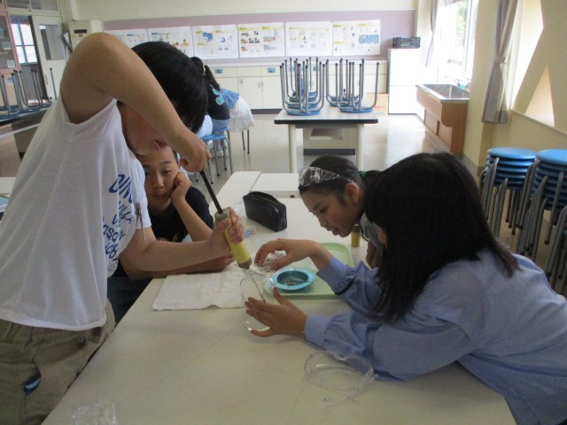 ものを燃やす前と燃やした後の気体を、気体検知管や石灰水で調べました。