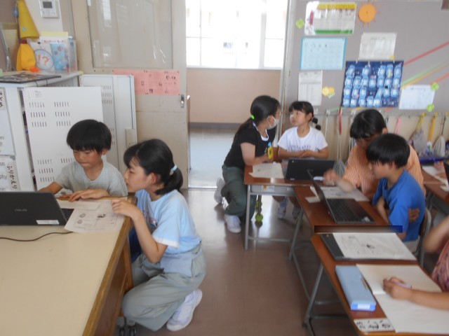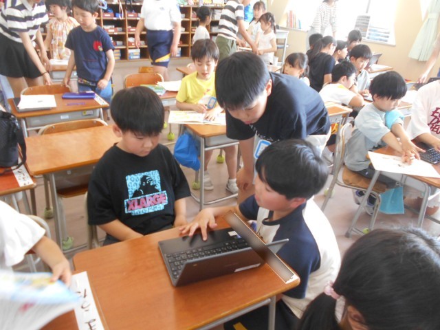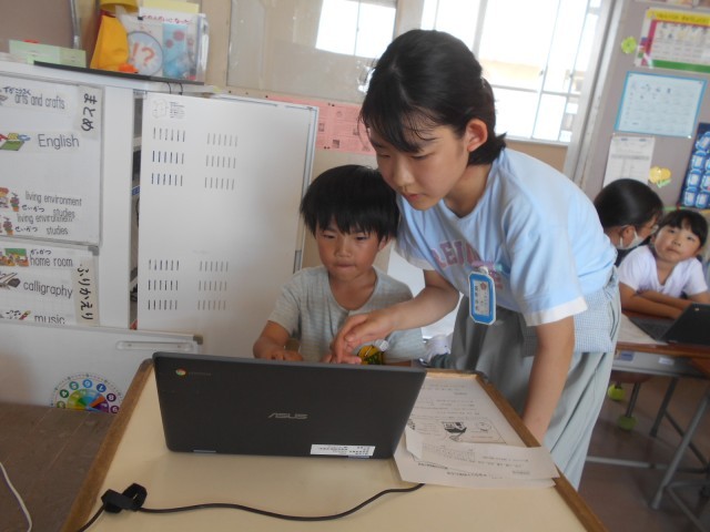 6年生にお手伝いをしてもらいながら、初めてクロムブックのログインを行いました。6年生は1年生の目線に合わせて、ていねいに教えてくれました。