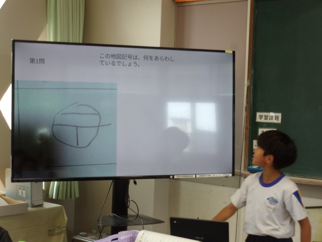 3時間目のテストに向けて、社会の地図記号の復習テストを作り、クイズのイベントをしていました。