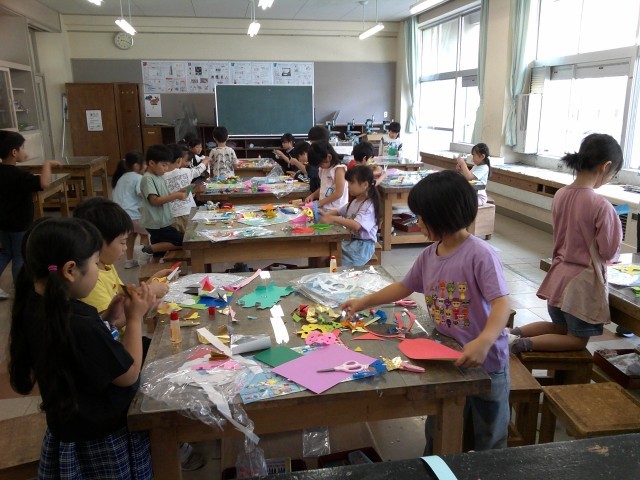 1年生は「ちょきちょきかざり」で、折り紙を折って切り、いろいろな形をつくる学習をしました。