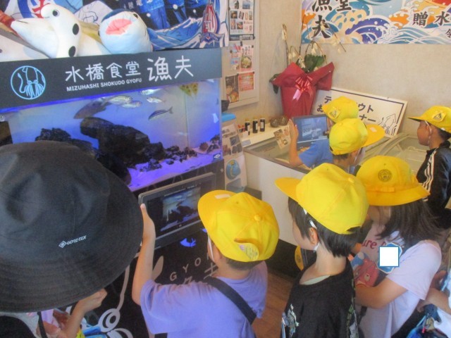 漁港近くの食堂では、お店の方のご厚意で中を見学させていただきました。中の水槽に夢中な子供たちでした。