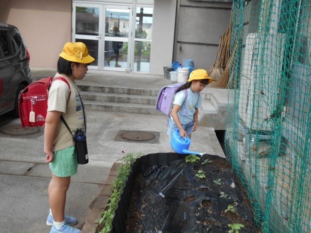 ヘチマの水やりをしてくれています。どんどん大きくなってほしいと願いながらお世話をしています。