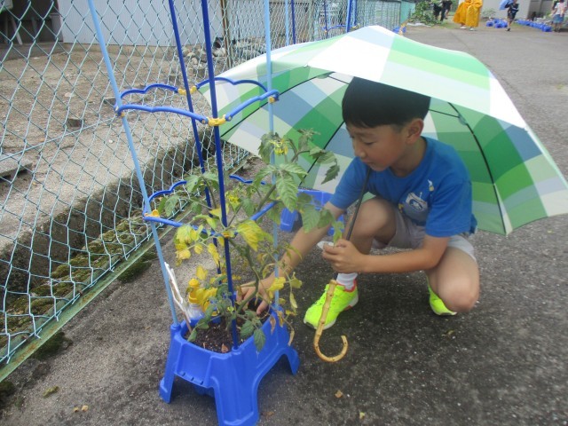 元気のない野菜に肥料をあげようと、雨の日でもお世話を欠かしません。