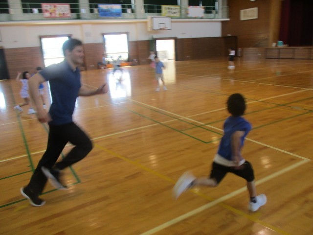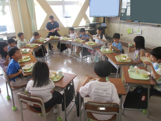 休み時間にはおにごっこ(tug of war)をしたり、給食を一緒に食べたりしながら、いろいろな言葉を英語で話しました。