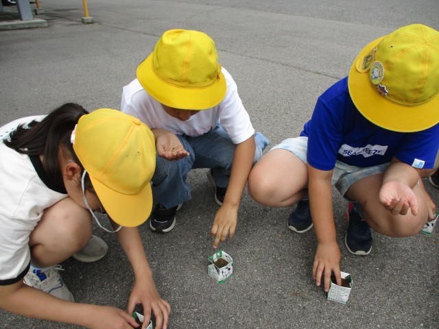 ヒマワリの種を植えました。大切に水をあげて、6年生の身長を越える高さまで大きく育てましょう。