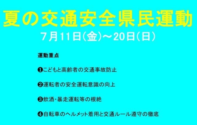 夏の交通安全県民運動 公開日 2025/06/29 更新日 2025/06/29 お知らせ 7月11日(金)から20日(日)までです。 自転車緒ヘルメット着用や交通安全ルール遵守について、ご家庭でもお子さんと話してください。【富山県警察】夏の交通安全県民運動