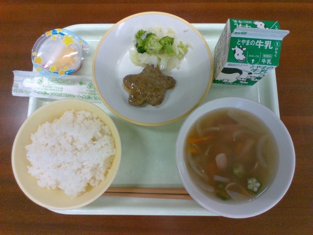 七夕献立でした。天の川スープに星に見立てたオクラが入っていたり、ハンバーグが星形だったりと栄養士さんの工夫が散りばめられていました。楽しくいただけます。