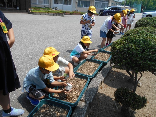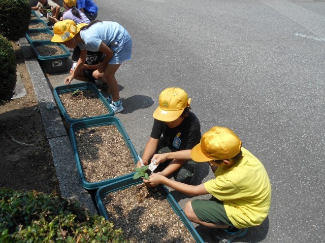 自分たちの育てたひまわりの苗をプランターに植えかえました。