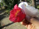 天せの森であかいつばきとしろいつばきを見つけたよ。きれいだったよ。かぞくに見せ...