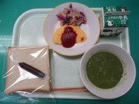 ・食パン ・牛乳🥛 ・オムレツのトマトソースかけ・紫キャベツのマリネ ・ほうれん草のポタージュ ・チョコペン検食、異常なし。チョコペンで、食パンにいろいろなことをかく子がたくさんいるでしょう。