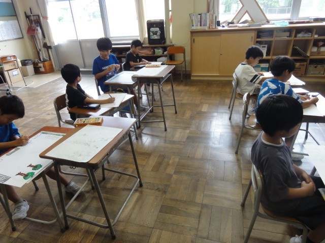 1・2年生は、図画工作科の学習で心に残ったことを絵で表現しています。プールに入ったことや縦割り遠足等、各自が楽しかった思い出を表していました。