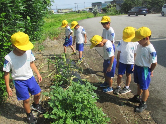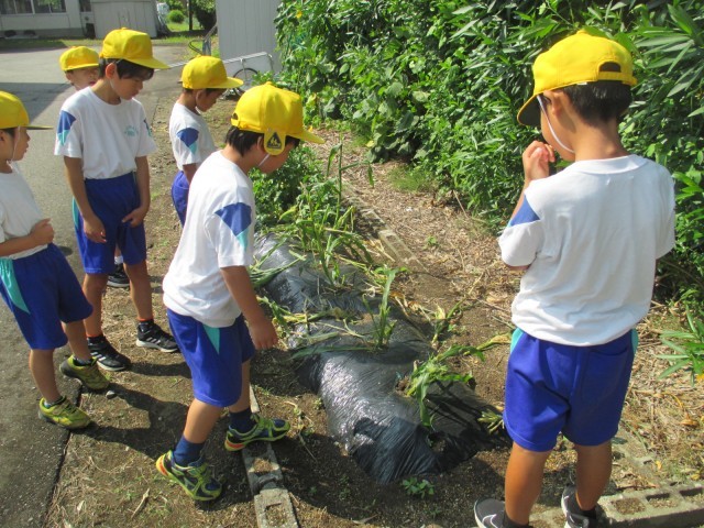1・2年生が育てていて実り始めていたトウモロコシが、何かの動物にかじられていました。子供たちは残念に思いながらも、残ったジャガイモは何とか収穫できないかと心配しています。