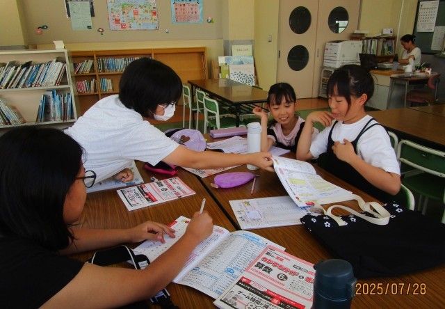 25日に引き続き、本日も熱中症警戒アラートが発令されたため、プール開放は中止としました。図書室開放に来た子供たちは、涼しい図書室で、時々教え合いながら学習しています。